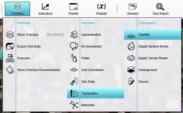 - In the overlay popup menu, hover over Topography and click on the option Satellite.