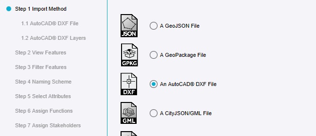 A variety of data formats and data sources is supported by the Tygron Platform. Select the file type in which your urban plan is available. (If it's a GeoJSON file, select "GeoJSON". If it's a DXF file, select "AutoCAD DXF").