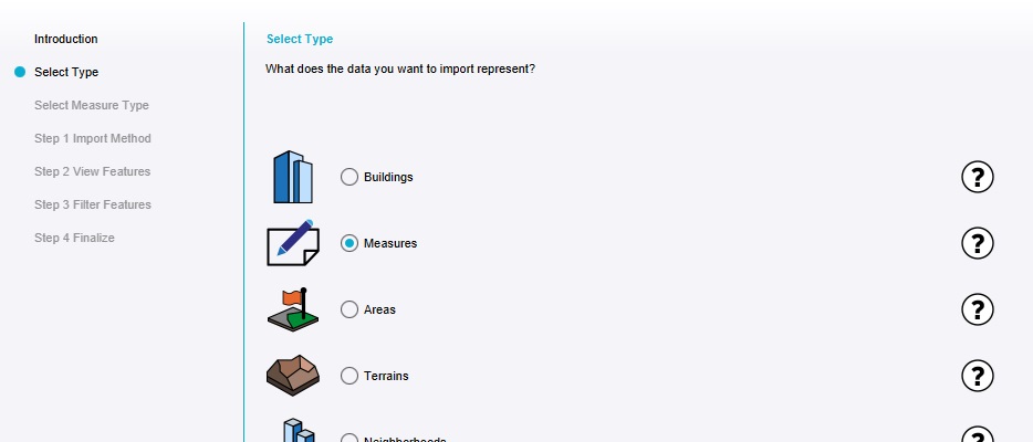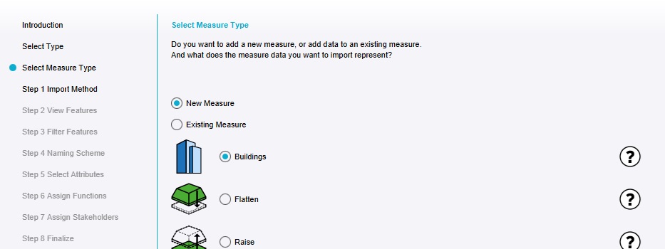 Measures can be composed of a variety of Item types. During this tutorial the focus has been on the importing of Buildings, which form the largest part of the majority of urban development plans. However, many plans also contain additional information on aspects of development which are not strictly new Buildings, and related to that, elements other than Buildings which can affect the results of calculation models.