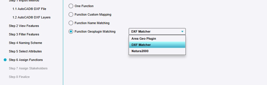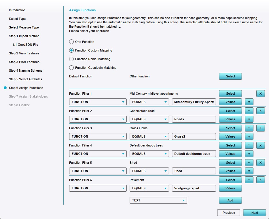 There are 2 main ways to ensure imported data is directly compatible with the Tygron Platform without the need for further manual definitions. One way is to ensure the data, when it is imported, has an Attribute the value of which exactly matches the name of a Function in the Tygron Platform, and selecting the "Name Mapping" option in the wizard to use this commonality. While easy, this does require that the data to be imported is "prepared" with these Tygron Platform-specific values.