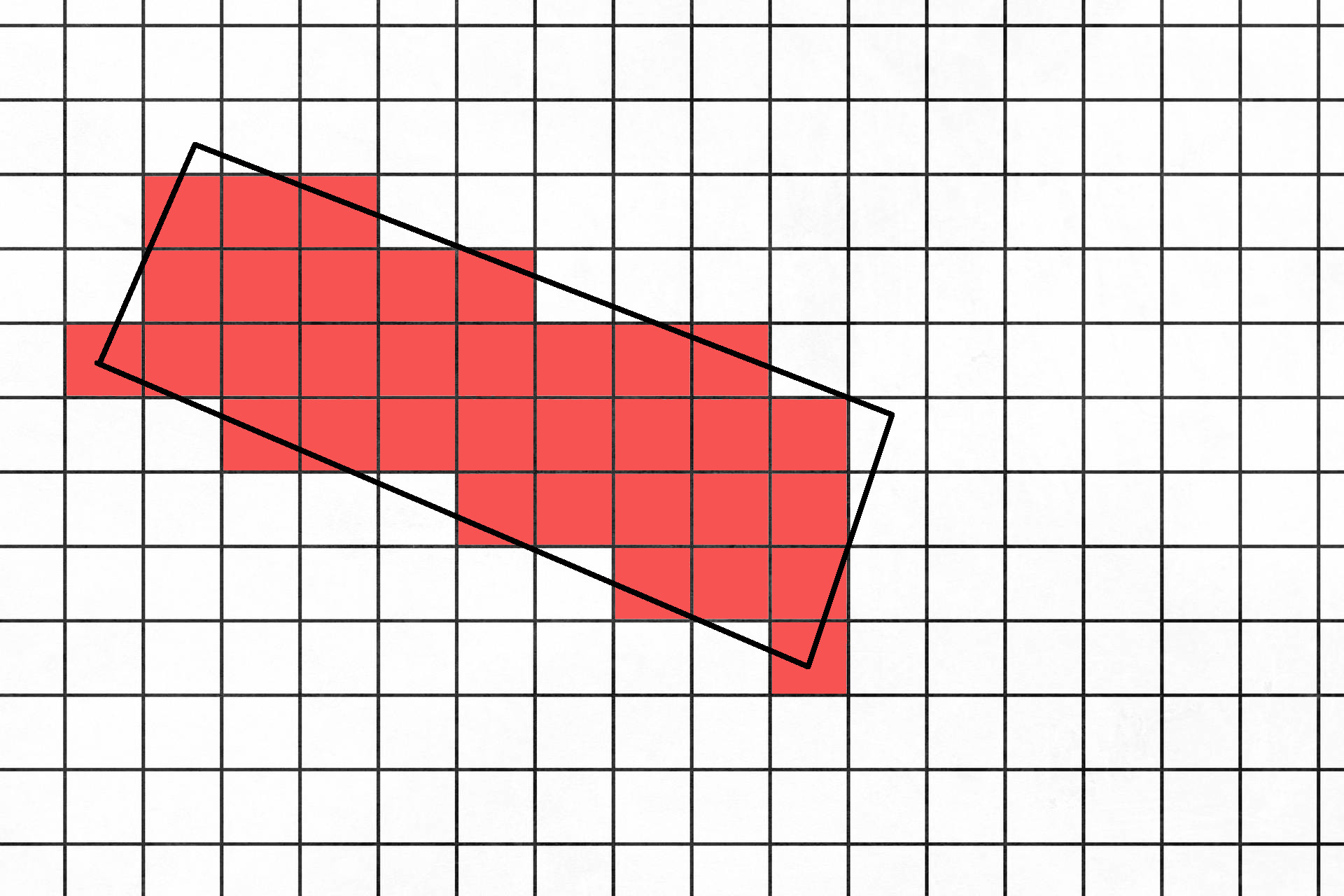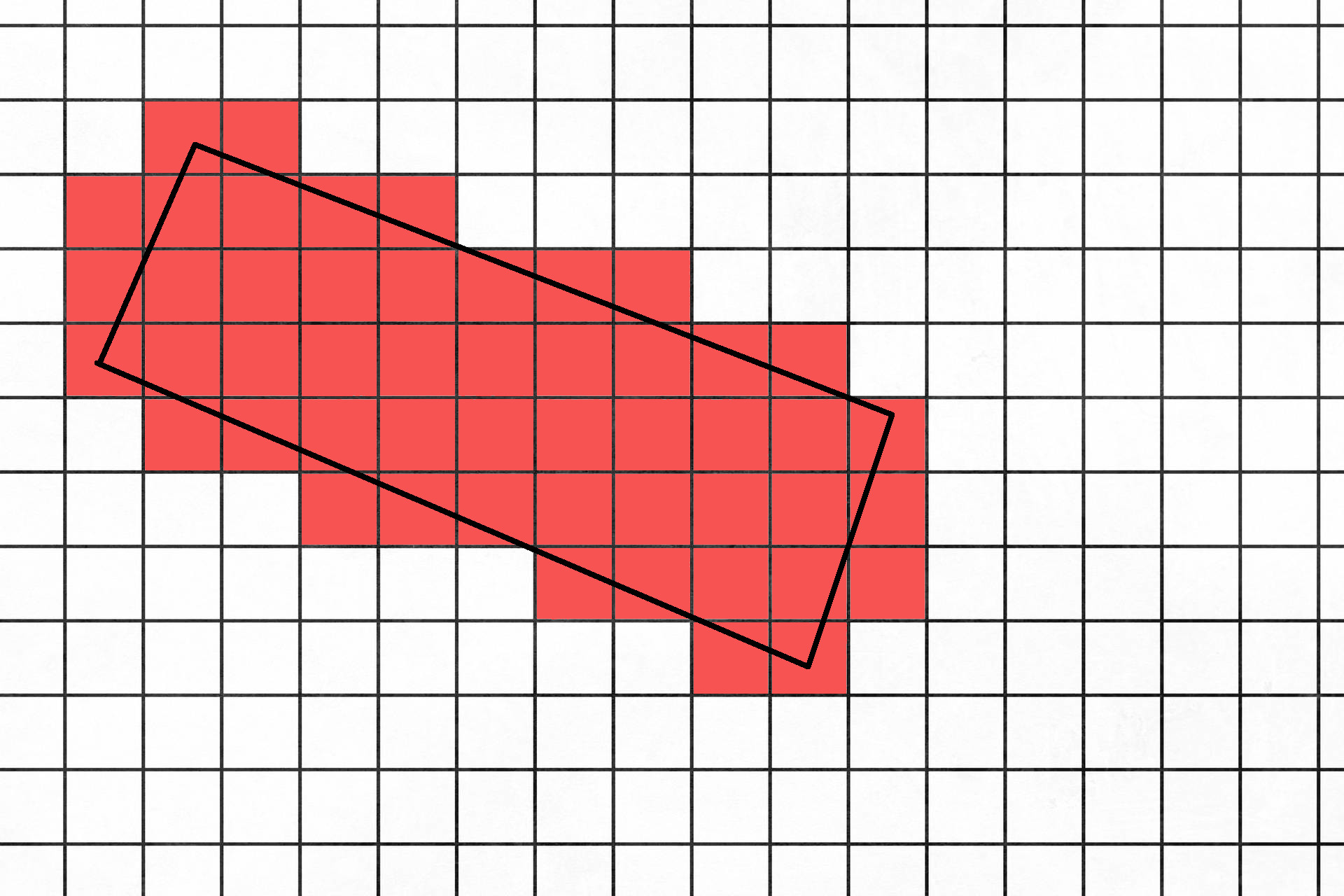 However this will create a small overshoot resulting in larger cell area then the original polygon. To correct for this one could also rasterize based on the center point. As displayed below: